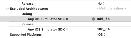 현재 m1 Mac을 쓰고있으므로 arm64로 빌드해야 되기 때문에 x86_64를 제외해주니까 해당 오류가 사라졌다.
